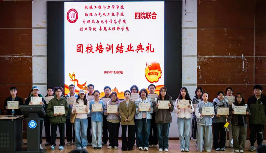 11月30日下午15时,成人短视频-成人短视频app 、物理与光电工程学院、自动化与电子信息学院、创业学院 卓越工程师学院四院联合团校培训结业典礼顺利举行。成人短视频 专职辅导员周岚亭老师,物理与光电工程学院团委、学生会团一副邓雨凡,自动化与电子信息学院团委、学生会团二副肖金欢,创业学院 卓越工程师学院团委、学生会团二副罗笔汇受邀出席典礼。
