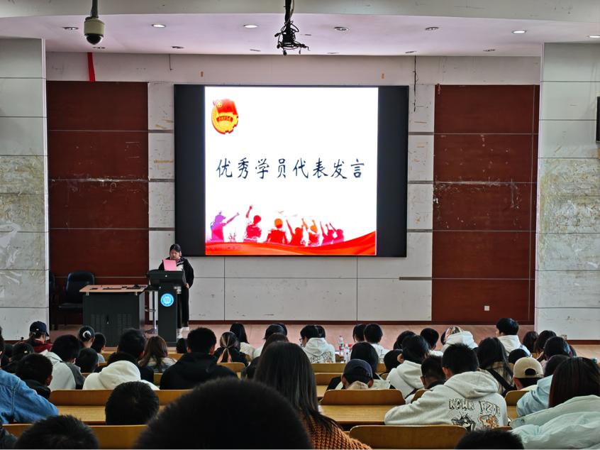 结业典礼伊始,一段精心制作的回顾视频带领全体学员重温了培训期间的难忘时光。此次团校培训中,学员们系统学习中国历史文脉与精神谱系,深入探寻红色精神的时代内涵,在理论学习与实践感悟中厚植家国情怀、凝聚奋进力量。随后,25级工商管理(创业菁英班)的贾玉娇同学作为优秀学员代表发言,她结合自身培训经历,分享了对新时代青年责任与担当的理解,生动诠释了湘大学子昂扬向上、勇毅前行的精神风貌。